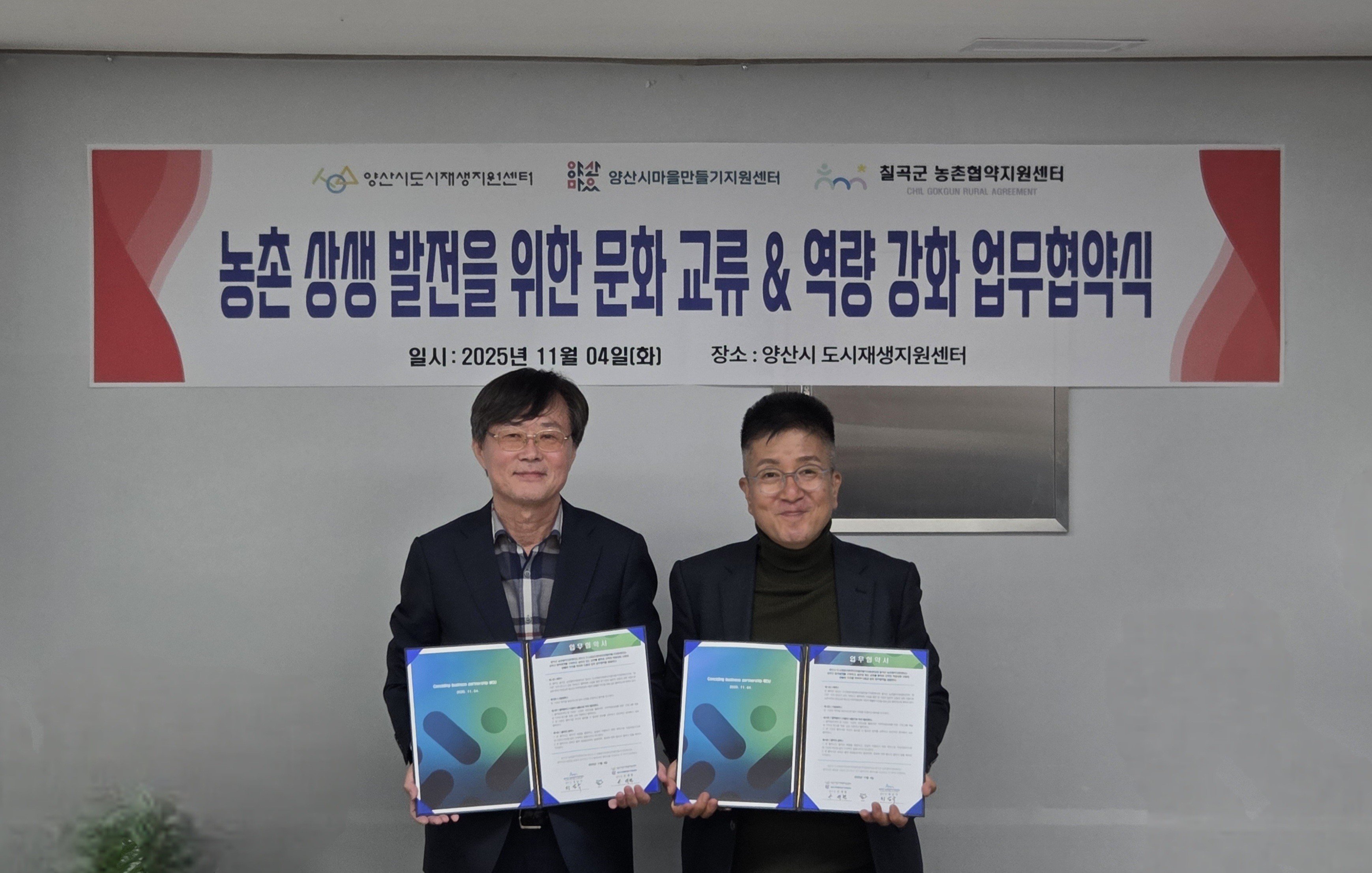 [아시아월드뉴스] 양산시도시재생지원센터와 칠곡군농촌협약지원센터는 지난 4일 농촌 상생발전을 위한 문화 교류 및 역량강화 업무협약식을 개최하고 농촌 간의 지속가능한 상생협력 체계 구축을 위해 협약을 체결했다.
