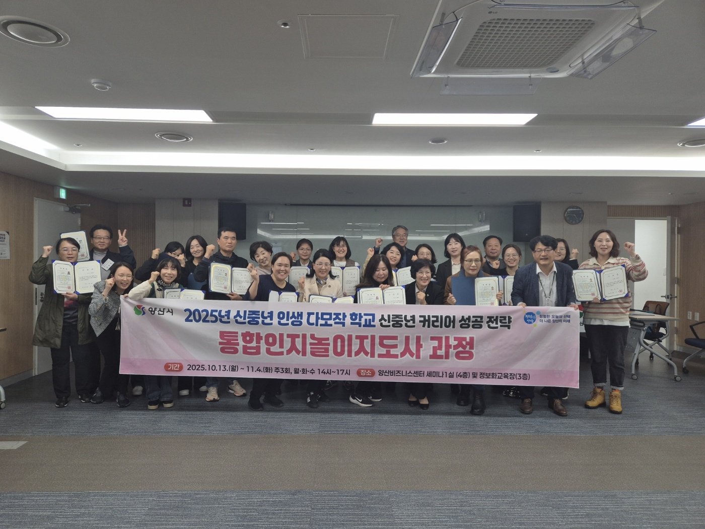[아시아월드뉴스] 양산시는 지난 11월 4일 양산비즈니스센터에서 4층 세미나1실에서 ‘신중년 인생 다모작학교’수료식 및 통합인지놀이지도사2급 자격증 수여식을 가졌다.