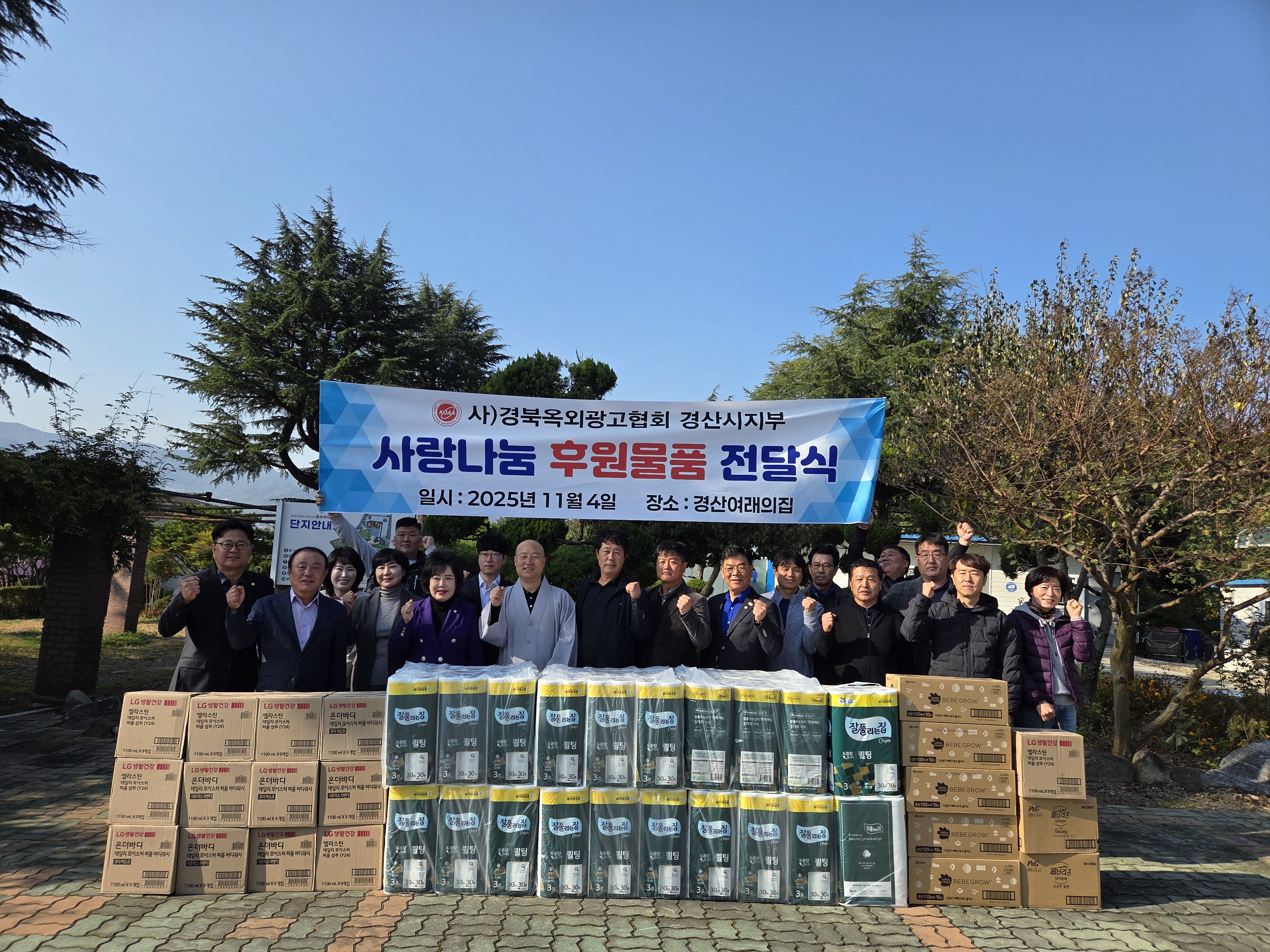[아시아월드뉴스] 사단법인 경북옥외광고협회 경산시지부는 4일 경산여래의 집과 경산시노인복지회관을 방문해 경산시의회 의원들이 참석한 가운데 백미 10kg 40포와 휴지, 샴푸 등 시가 250만원 상당을 각각 2개소에 전달식을 가졌다.