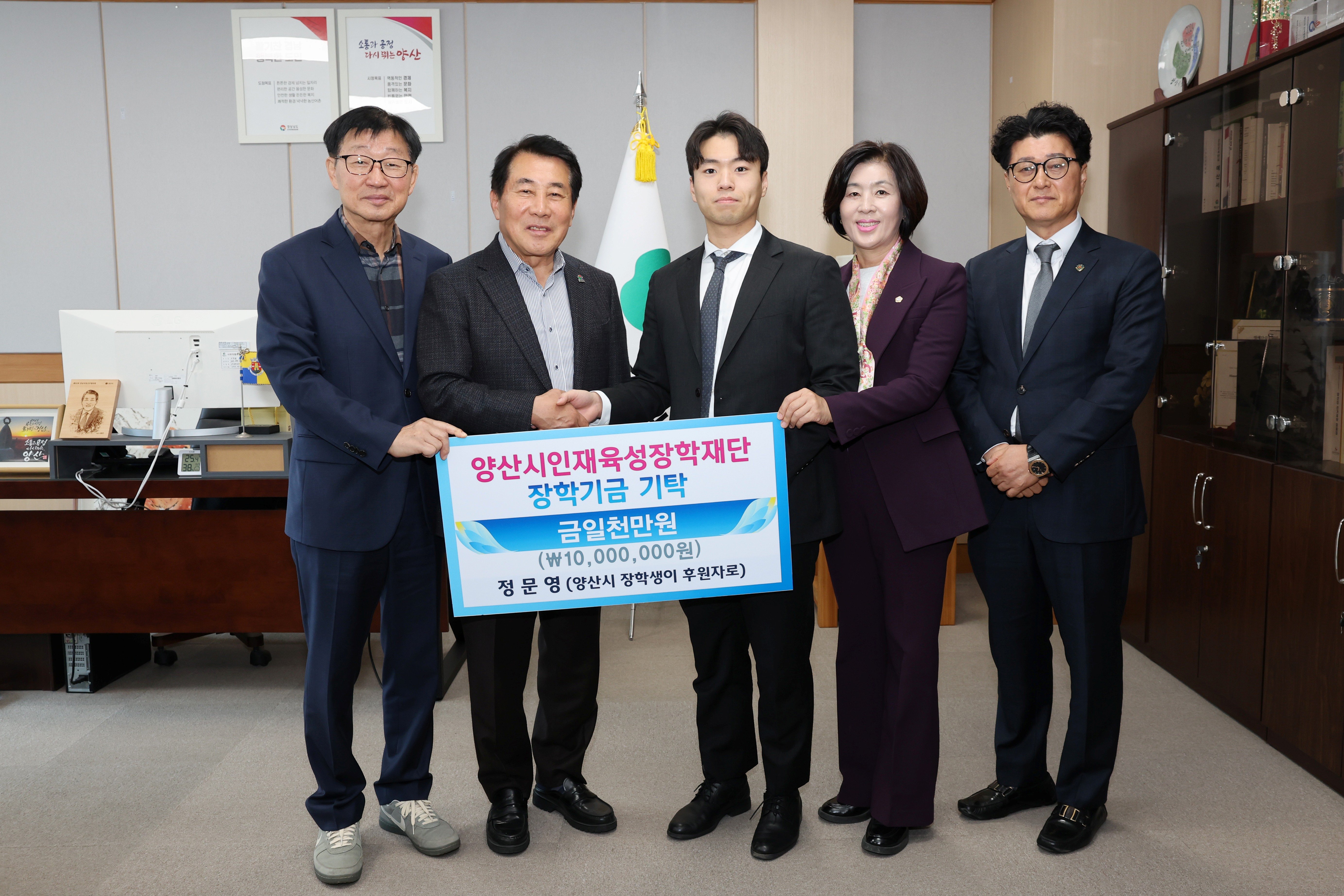 [아시아월드뉴스] 한양대학교병원에 근무 중인 정문영 의사가 5일 양산시를 방문해 양산시인재육성장학재단에 장학금 1,000만원을 기탁했다.