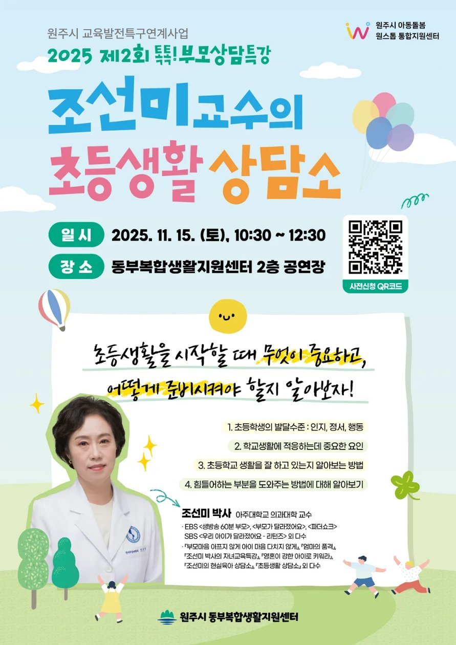 아주대학교 의과대학 조선미 박사가 초등 자녀의 발달 특성과 학교생활 적응을 돕는 방법 등을 주제로 강연을 진행할 예정이다.