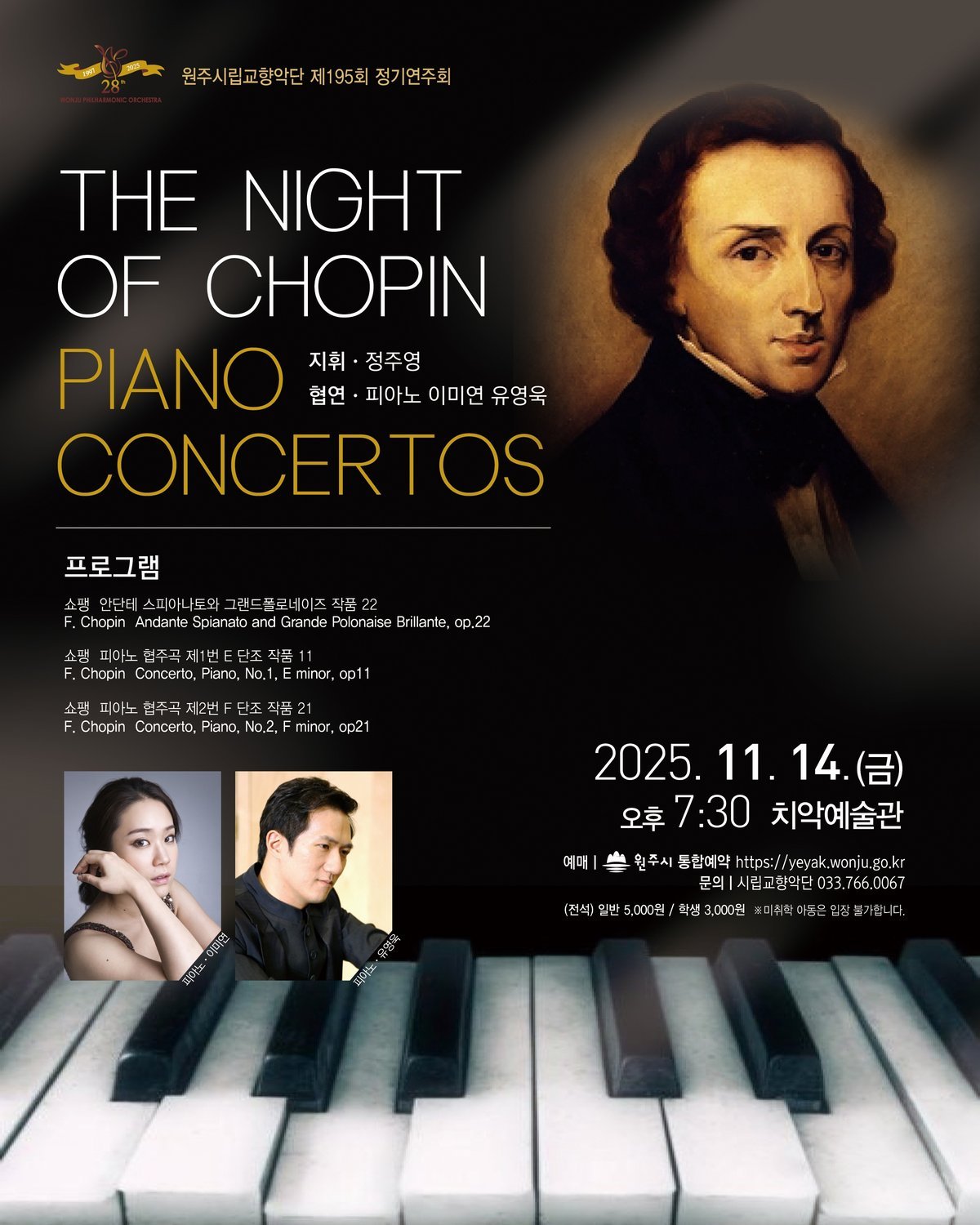 [아시아월드뉴스] 원주시립교향악단은 오는 14일 오후 7시 30분, 치악예술관에서 제195회 정기연주회 ‘The Night of CHOPIN’을 개최한다.