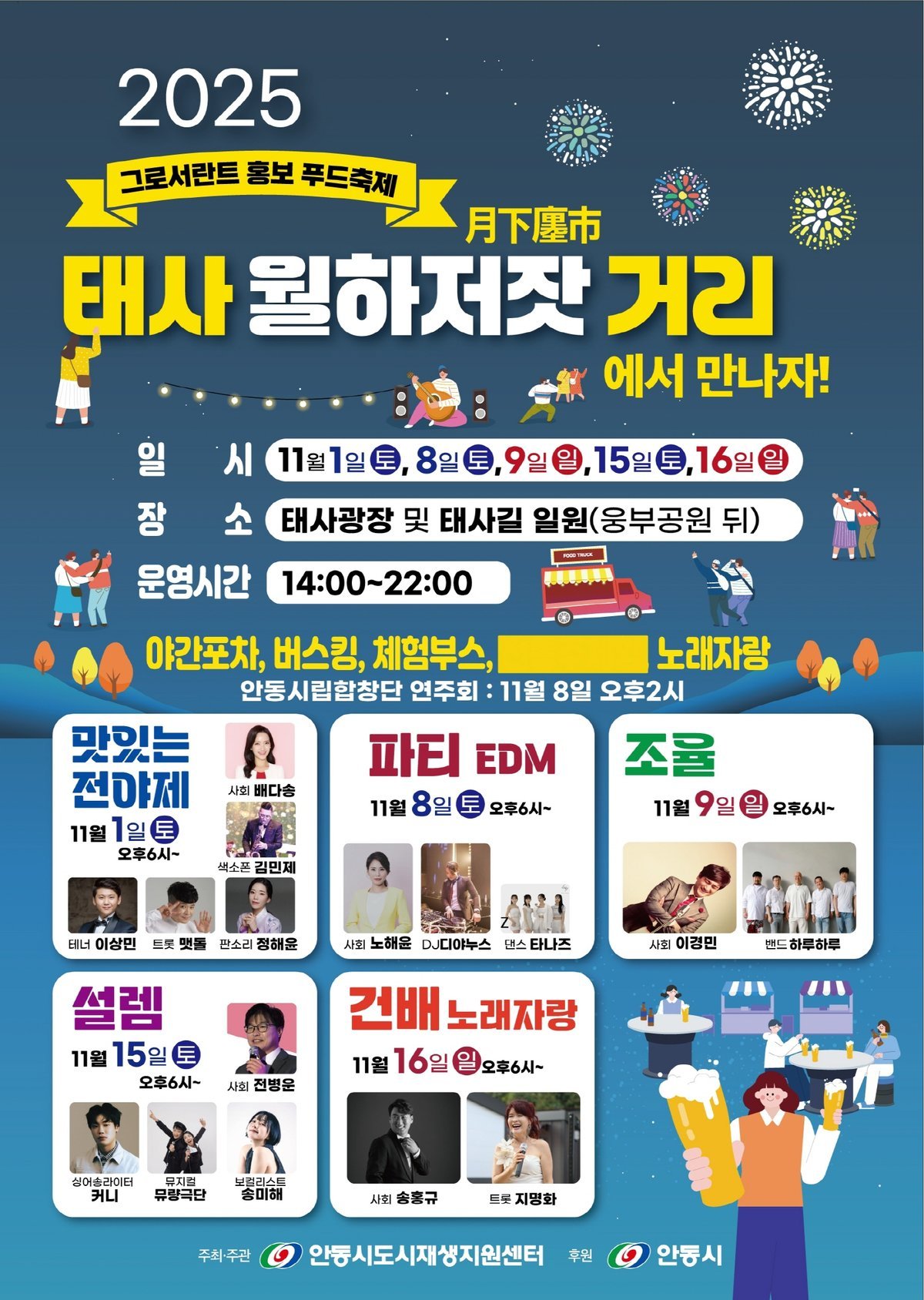 ‘태사 월하저잣’이라는 부제 아래, 먹거리와 문화 콘텐츠를 함께 즐길 수 있는 축제로 관광객과 시민들이 함께 어울려 지역의 새로운 공간인 ‘그로서란트’를 중심으로 다양한 체험과 공연이 마련된다.
