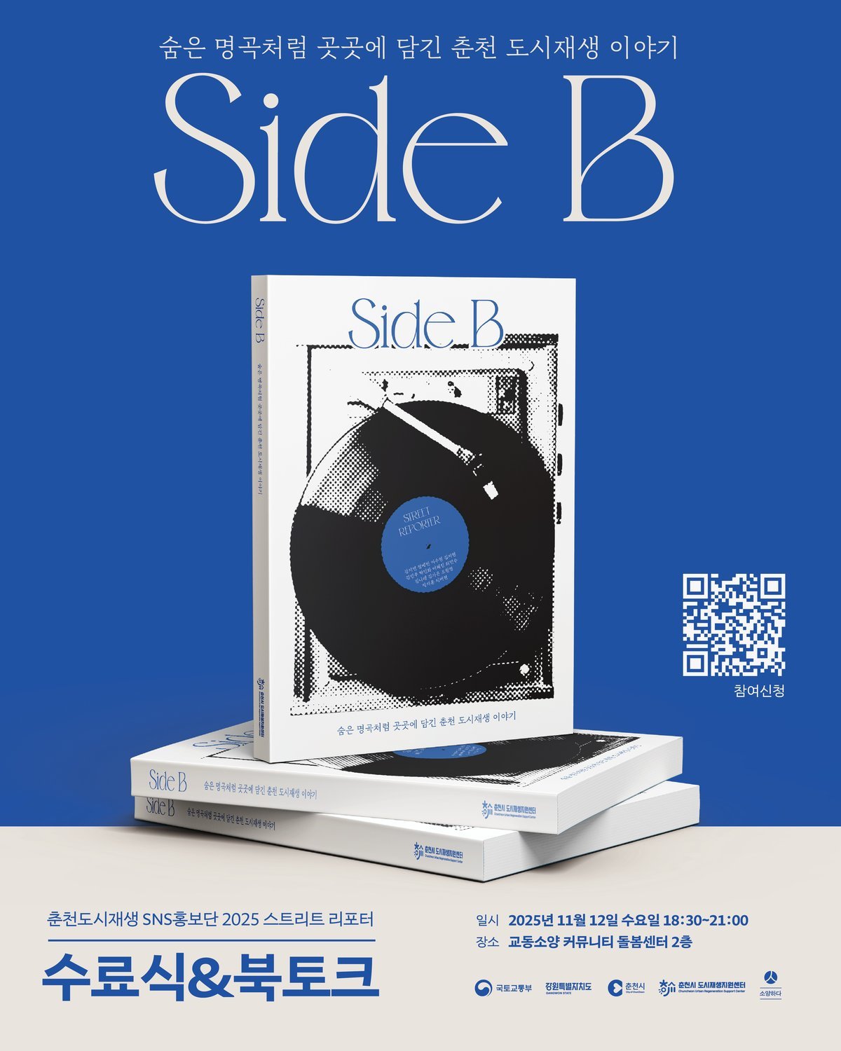 춘천시 관계자는 “‘Side B’는 행정이 아닌 시민의 눈으로 바라본 도시재생의 이야기”며 “이번 행사가 시민이 함께 도시재생의 의미를 나누고 참여하는 계기가 되길 기대한다”고 말했다.