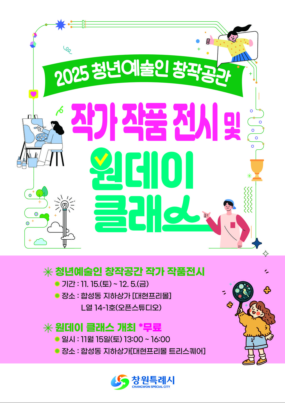 [아시아월드뉴스] 창원특례시는 오는 11월 15일 합성동 지하상가에서 청년예술인 창작공간 입주 작가들의 성과 공유를 위한 작품 전시회와 시민과 함께 창작의 즐거움을 나누는 원데이클래스를 개최한다고 밝혔다.