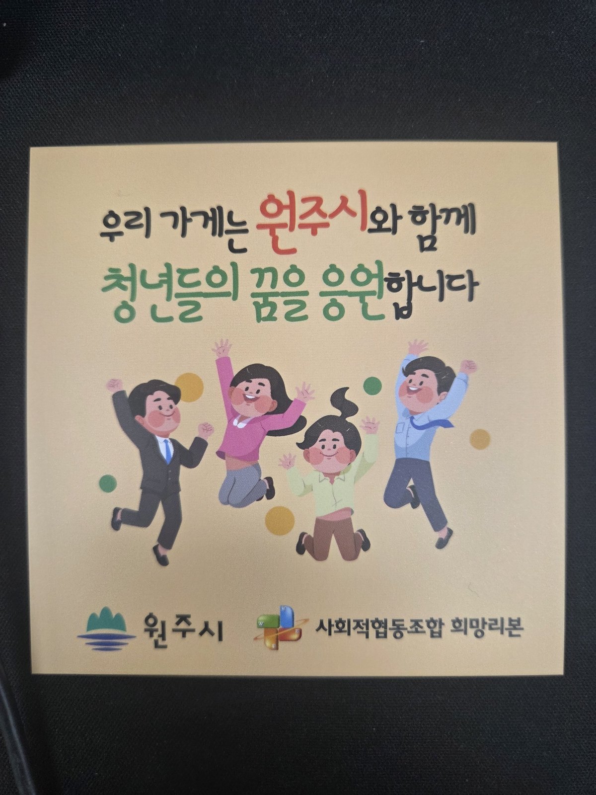 엄병국 원주시 기업지원일자리과장은 “지역 청년들을 응원하는 데 뜻을 함께해 주신 자영업자분들께 감사드린다”며 “앞으로도 청년이 건강하게 성장하고 지역사회가 더욱 활기를 띨 수 있도록 원주시가 적극 지원하겠다”고 말했다.