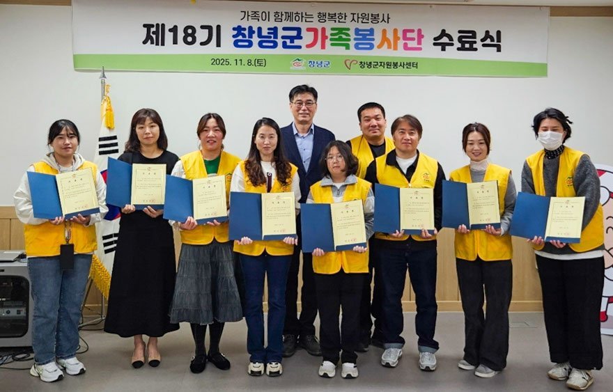 [아시아월드뉴스] 창녕군 보도자료배포 시부터 보도해 주시기 바랍니다행복나눔과 복지기획팀 신선정, 담당자 허영민 / 작성일 : 11월 11일 함께 나누는 행복, 함께 자라나는 나눔의 가치 창녕군은 지난 8일 창녕군자원봉사센터 교육장에서 ‘제18기 창녕군가족봉사단 수료식’을 개최했다고 밝혔다.