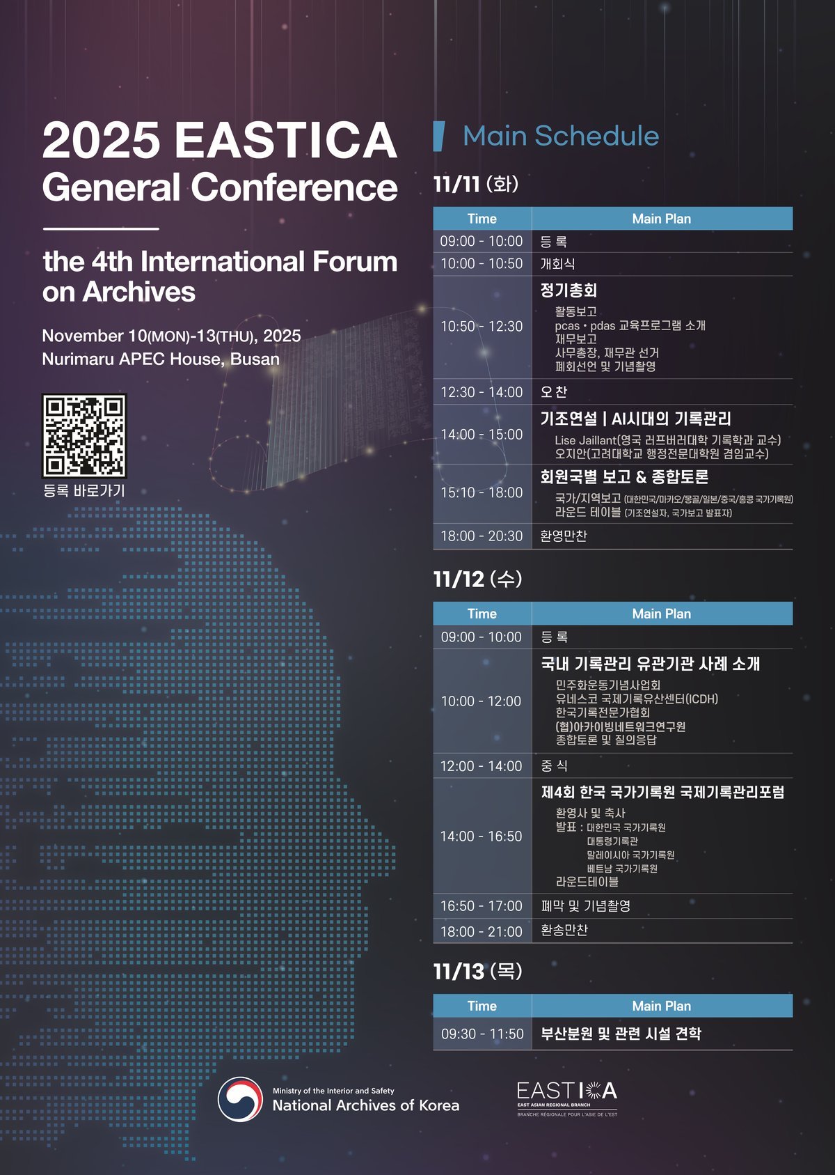 ‘2025년 EASTICA 정기총회’는 ‘기록의 대전환 : 파피루스에서 인공지능까지’를 주제로 개최되며 △총회, △기조연설, △회원국별 보고 및 종합토론 등이 진행된다.
