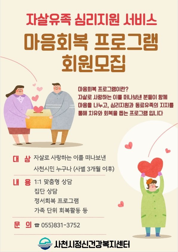 상담 및 프로그램 참여를 희망하는 유족은 사천시보건소 정신건강복지센터로 문의하면 된다.