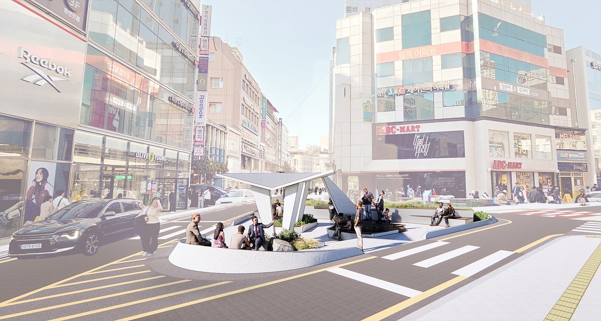 광장 중앙에는 햇빛과 비를 조절하는 캐노피 구조물이 설치돼 도심 속 그늘 쉼터 역할을 하고 계단형 데크벤치는 버스킹 등 시민들의 창의적인 활동을 지원한다.