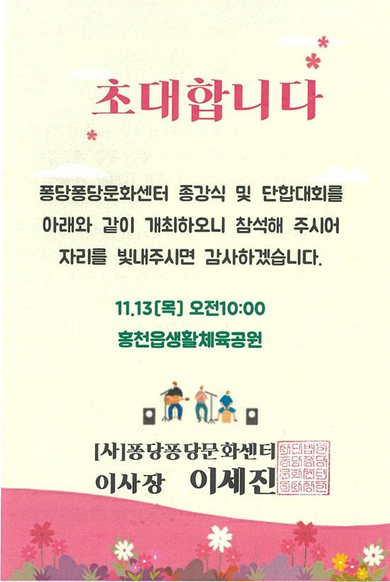 [아시아월드뉴스] 홍천군은 11월 13일 홍천읍 생활체육공원에서 ‘제4회 퐁당퐁당 문화센터 종강식 및 단합대회’를 개최한다고 밝혔다.