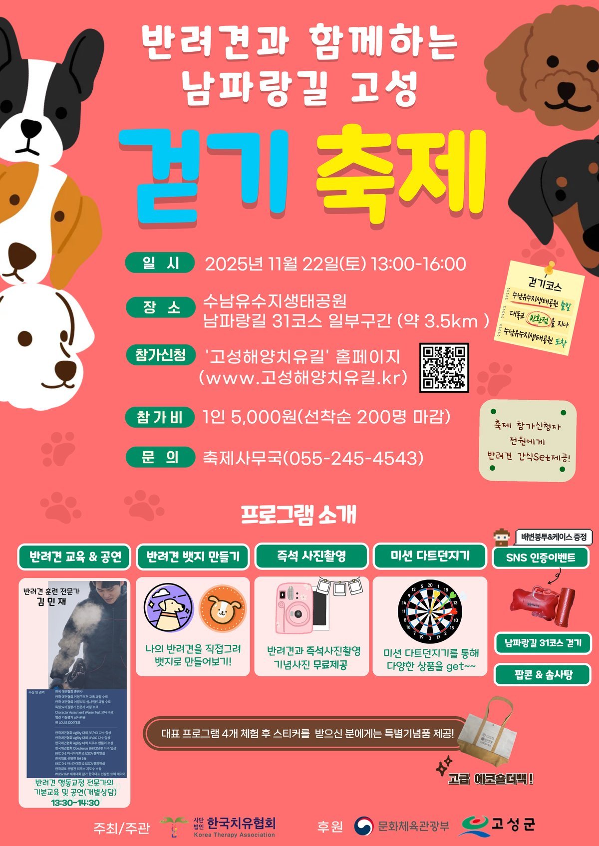 이상근 고성군수는 “이번 걷기축제는 반려동물과 함께하는 관광 콘텐츠를 통해 고성군의 아름다운 자연과 건강한 반려문화를 널리 알리는 계기가 될 것”이라며 “많은 분들이 가족 같은 반려견과 소중한 추억을 만들고 고성의 매력을 만끽하길 바란다”고 밝혔다.