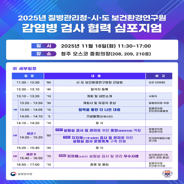 [아시아월드뉴스] 질병관리청은 11월 18일 충청북도 청주 오스코에서 전국 17개 시·도 보건환경연구원과 함께 ‘감염병 검사 협력 심포지엄’을 개최한다.
