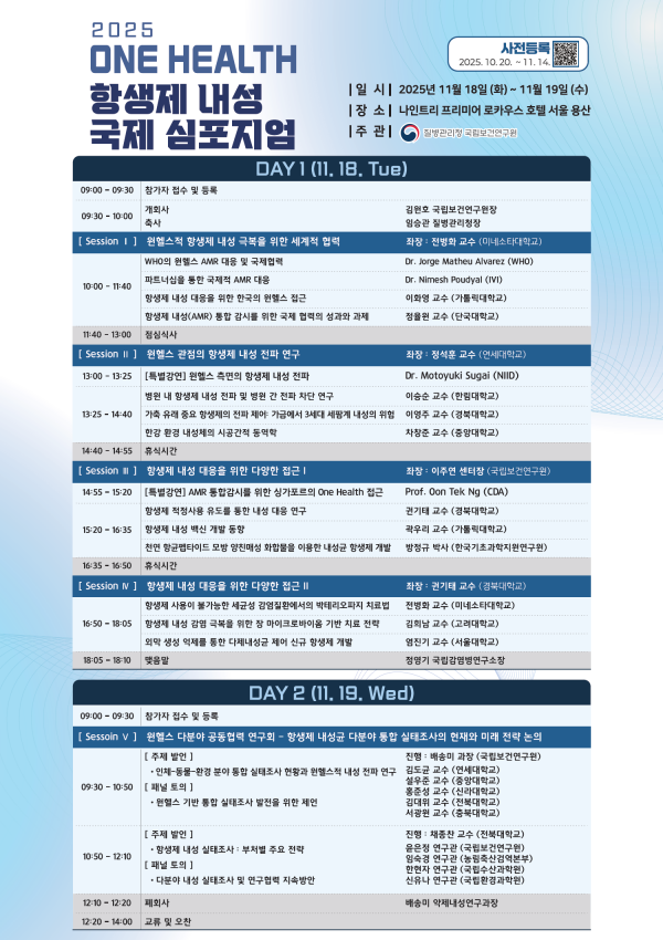 김원호 국립보건연구원장은 “원헬스 심포지엄은 그동안 항생제 내성이라는 국제적 보건 이슈에 대해 정부 관계자와 다분야 연구자들이 소통하고 협력하는 장으로 자리매김해 왔다”며 “이번 심포지엄을 통해 항생제 내성 대응의 현재와 미래를 조망하고 실질적인 협력 방안을 함께 모색해 나가겠다”고 밝혔다.