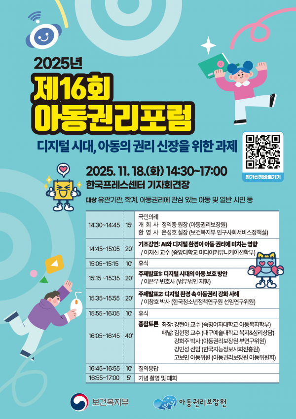 [아시아월드뉴스] 보건복지부와 아동권리보장원은 11월 18일 오후 2시 30분, 한국프레스센터 기자회견장에서 2025년 제16회 아동권리포럼을 개최한다.