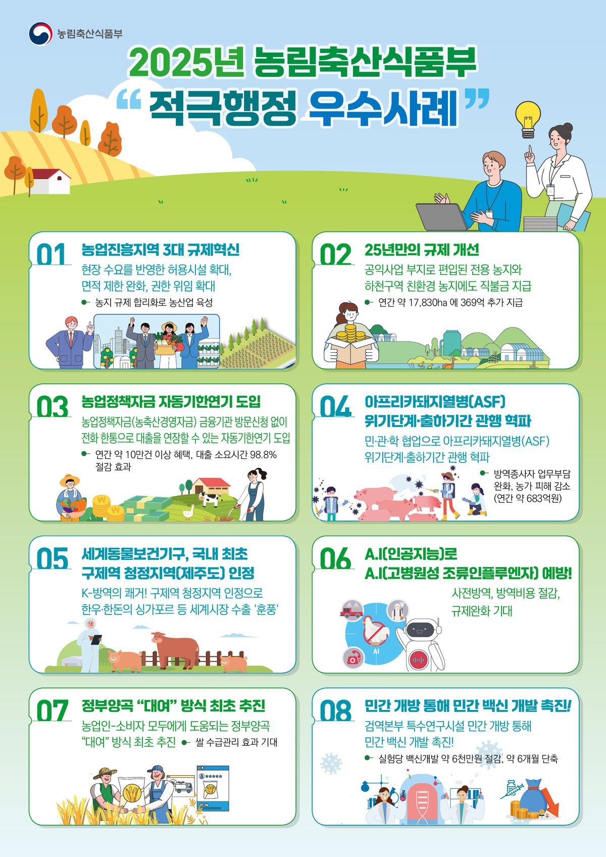 세부 과제로는 △‘농업진흥지역 3대 규제혁신’, △‘AI로 AI 예방’, △‘농업인 대출기한 자동연기’ 등이 대표적인 사례이다.(과제별 세부내용