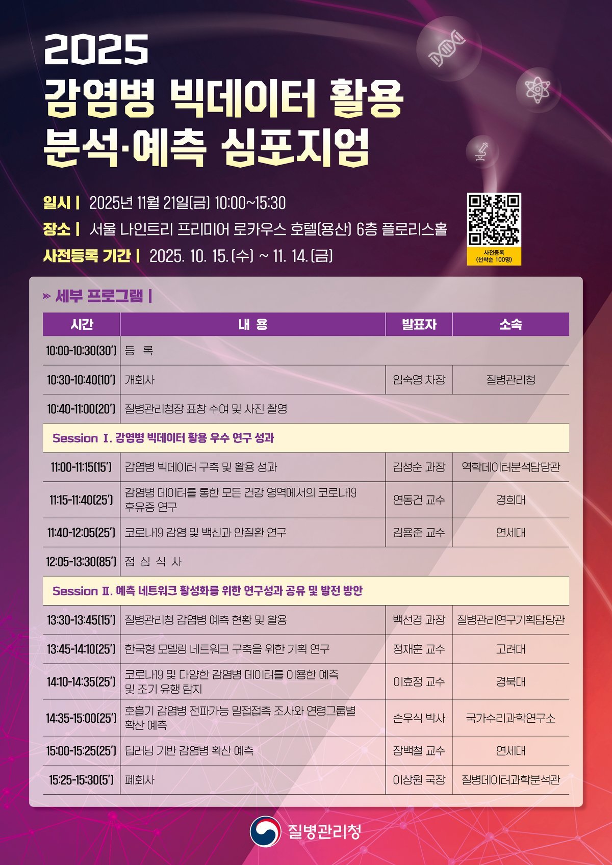 [아시아월드뉴스] 질병관리청은 11월 21일 「2025 감염병 빅데이터 활용 분석·예측 심포지엄」을 개최하고, 연구성과를 공유하며 향후 데이터 기반 정책 고도화 방안을 논의한다.
