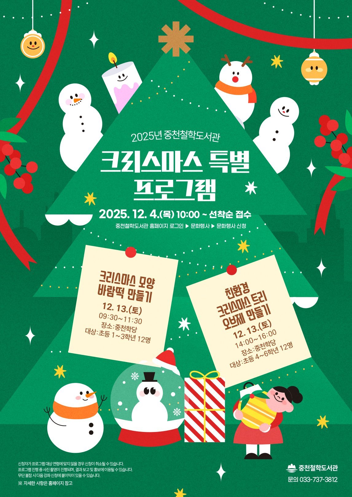 [아시아월드뉴스] 원주시 중천철학도서관은 크리스마스를 앞두고 오는 12월 13일 어린이들을 위한 특별 문화체험 프로그램을 운영한다.