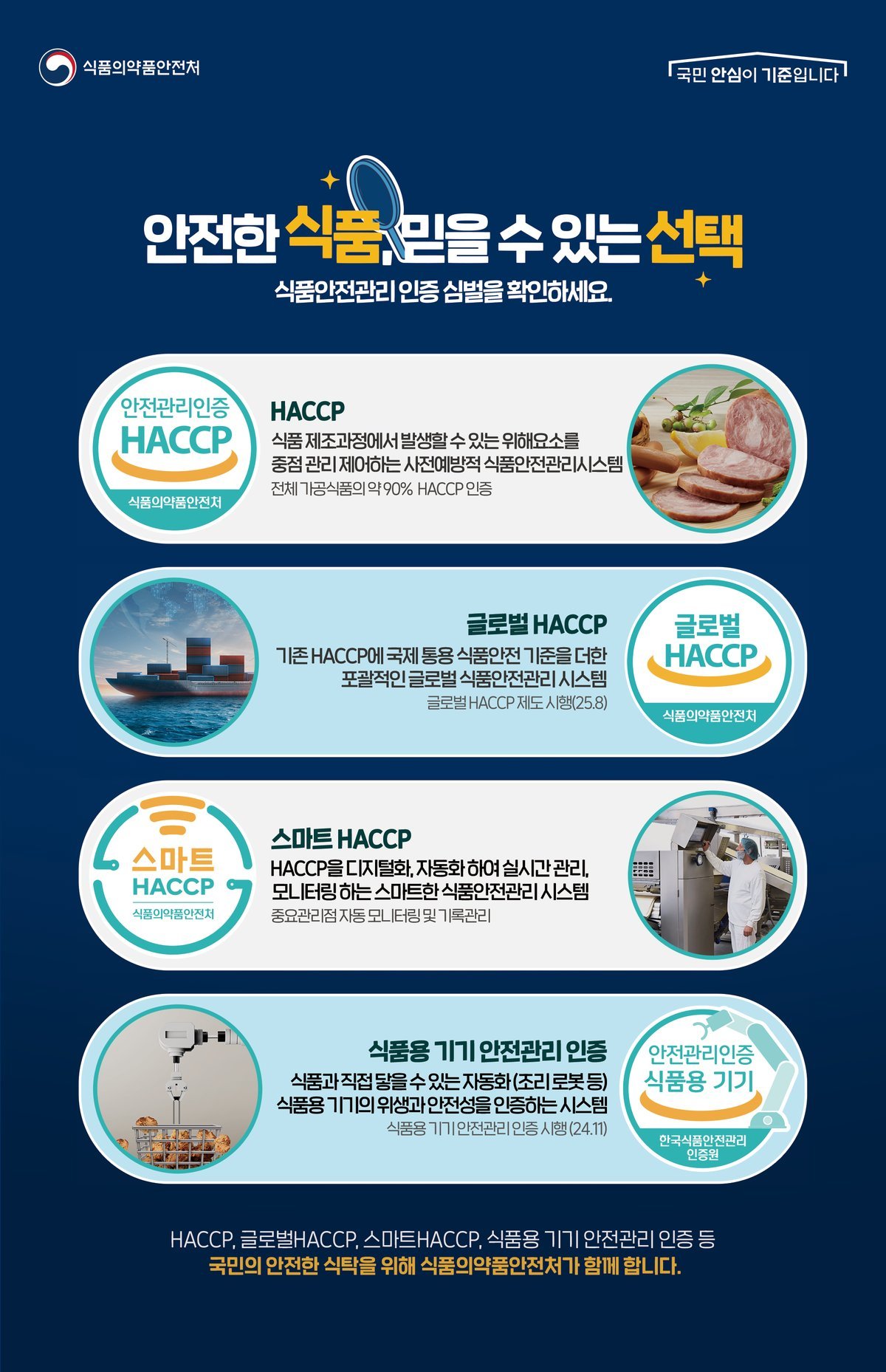 ‘해썹 제도’는 1995년 도입된 이후 식품 안전에 대한 국민 의식 수준이 높아지고 산업 환경이 급변함에 따라 ‘스마트 해썹’, ‘글로벌 해썹’, ‘식품용 기기 안전관리 인증’ 등으로 확대·고도화되어 왔으며, 우리 식품 안전 관리 체계의 글로벌 경쟁력 강화에 기여하는 대표적인 정책으로 자리매김했다.