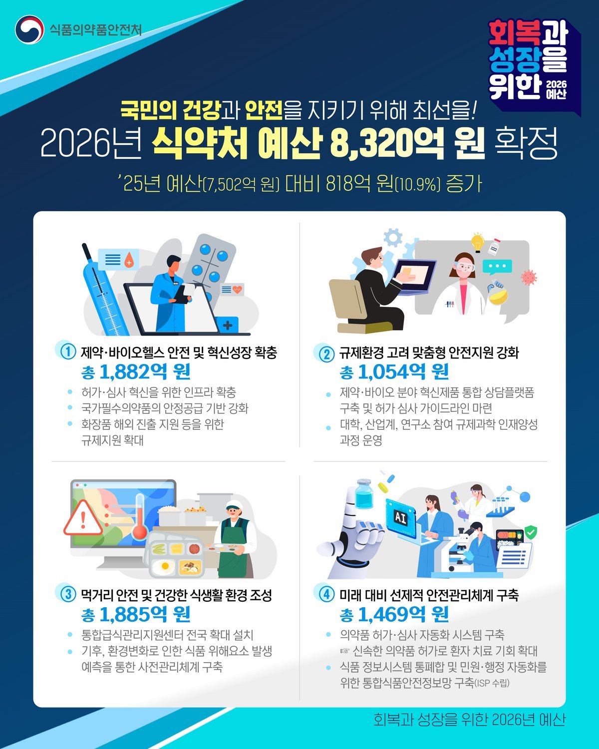 [아시아월드뉴스] 식품의약품안전처는 2026년도 예산을 올해 대비 818억원 증가한 총 8,320억원으로 최종 확정했다고 밝혔다.