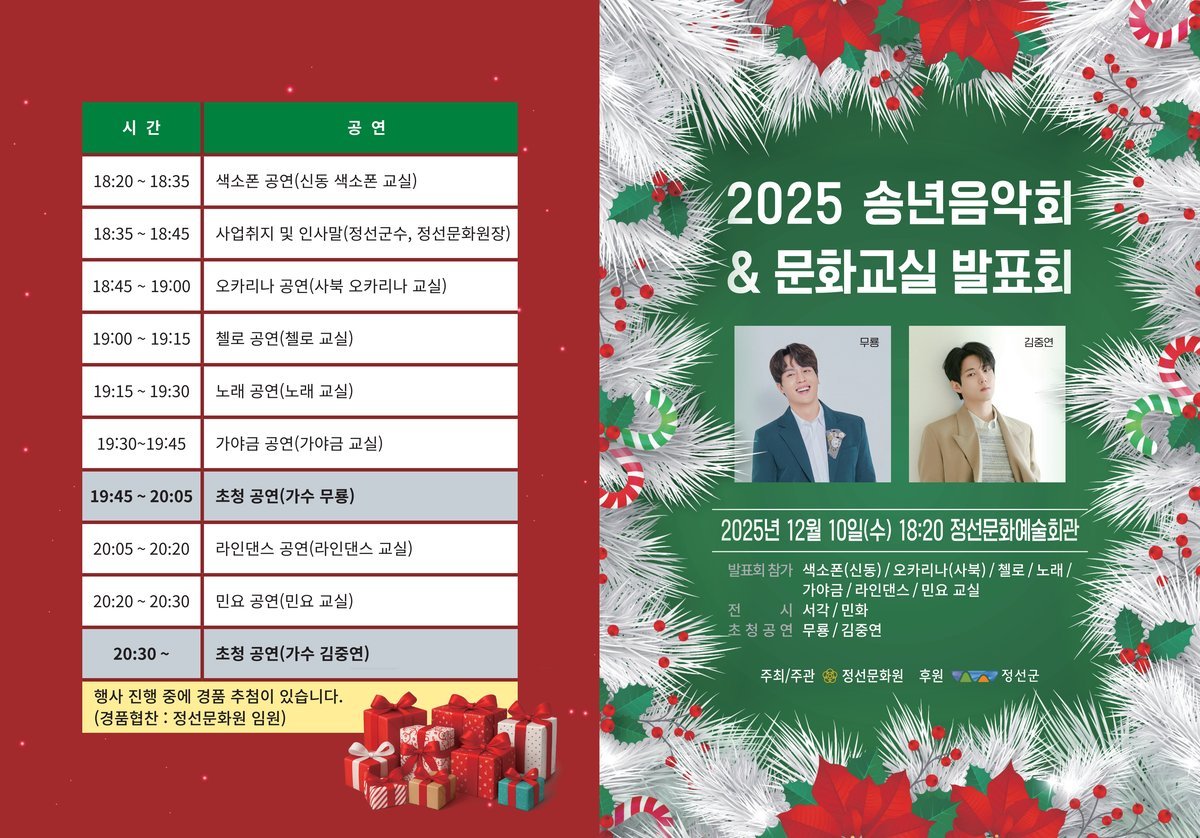 심재복 정선문화원 원장은 “정선 군민들이 함께 모여 따뜻하게 한 해를 마무리하는 시간이 되길 바라며, 수준 높은 공연과 발표를 준비한 만큼 많은 관심과 참여를 부탁드린다”고 전했다.