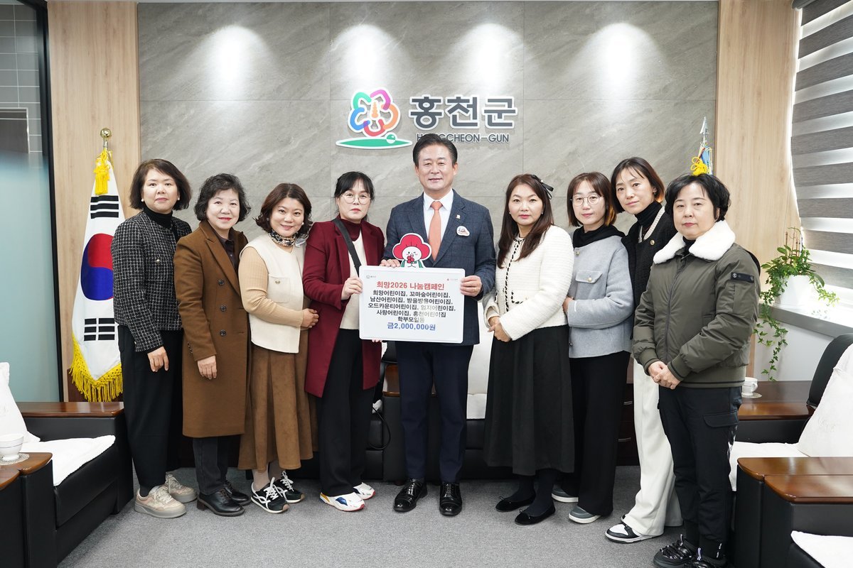 [아시아월드뉴스] 희망어린이집, 꼬마숲어린이집, 남산어린이집, 방울방울어린이집, 오드카운티어린이집, 엄지어린이집, 사랑어린이집, 홍천어린이집 학부모 일동은 12월 8일 홍천군청을 방문하여 어려운 이웃돕기 성금 200만 원을 기탁했다.