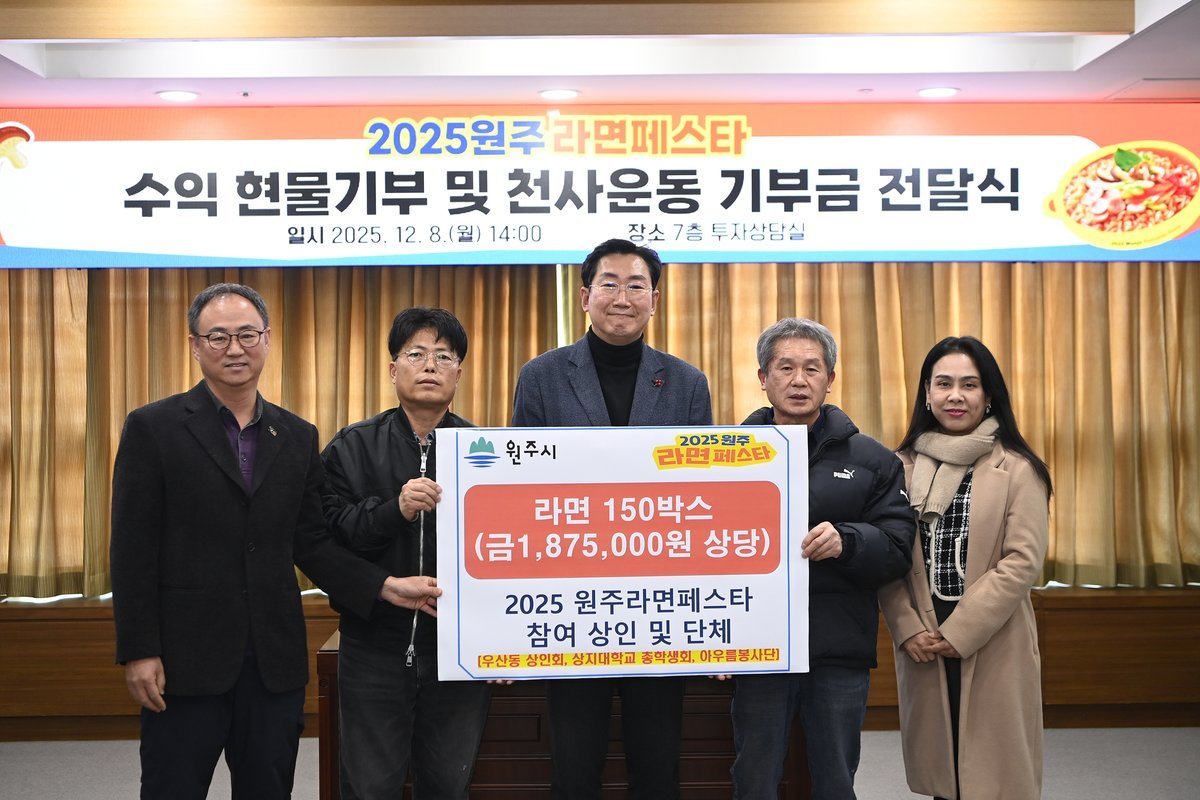 [아시아월드뉴스] 원주시는 8일 오후 2시, 시청 7층 투자상담실에서 ‘2025원주라면페스타 수익 현물 기탁 및 시민서로돕기 천사운동 기부금 전달식’을 개최했다.
