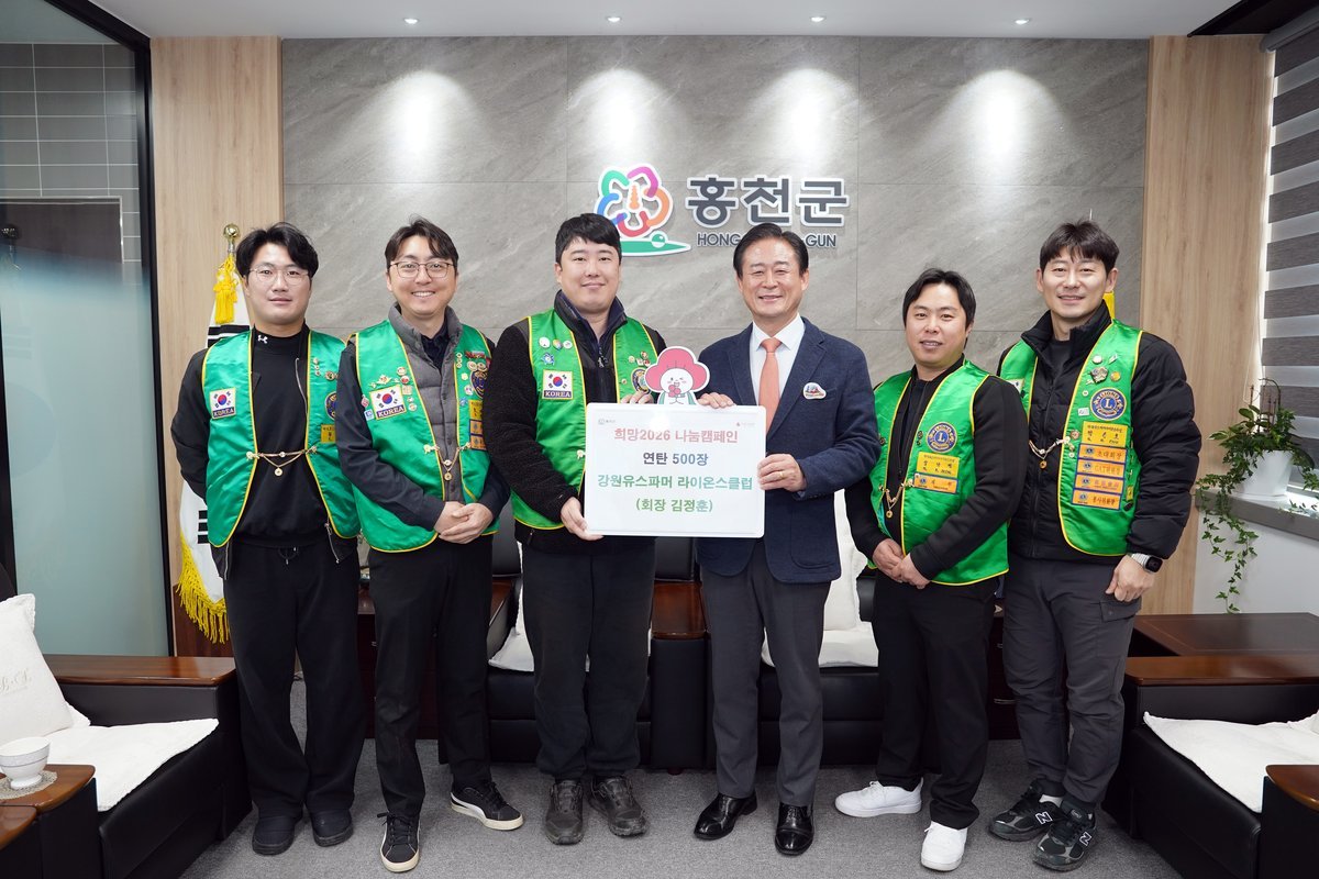 [아시아월드뉴스] 강원유스파머 라이온스클럽은 연말을 맞아 12월 10일 홍천군청을 방문하여, 연탄 500개를 기탁했다.