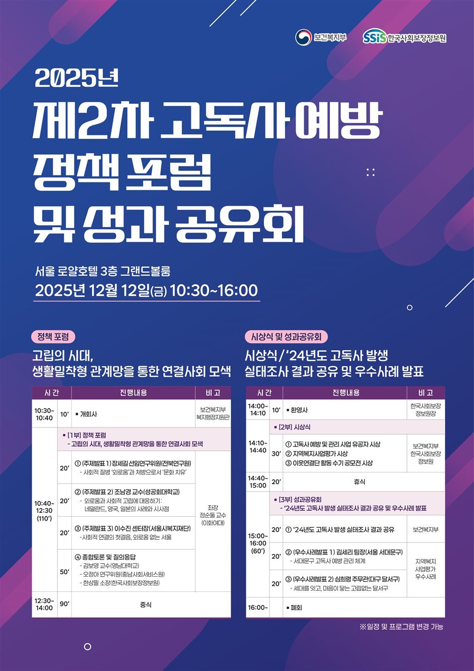 [아시아월드뉴스] 보건복지부와 한국사회보장정보원은 12월 12일 오전 10시 30분에 로얄호텔에서「고독사 예방 정책 포럼 및 성과공유회」를 개최하여 사회적 고립 해소를 위한 현장 중심의 선제적인 예방 전략을 모색하고, 고독사 예방에 기여한 유공자를 시상하고 우수사례를 공유하였다.