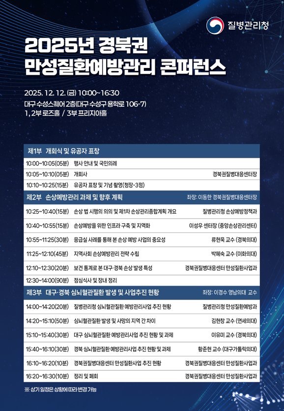 [아시아월드뉴스] 질병관리청 경북권질병대응센터는 12월 12일 10시 대구 수성스퀘어에서 지역사회 만성질환 관리 협력체계 강화를 위한 「2025년 경북권 만성질환예방관리 콘퍼런스」를 개최*한다.