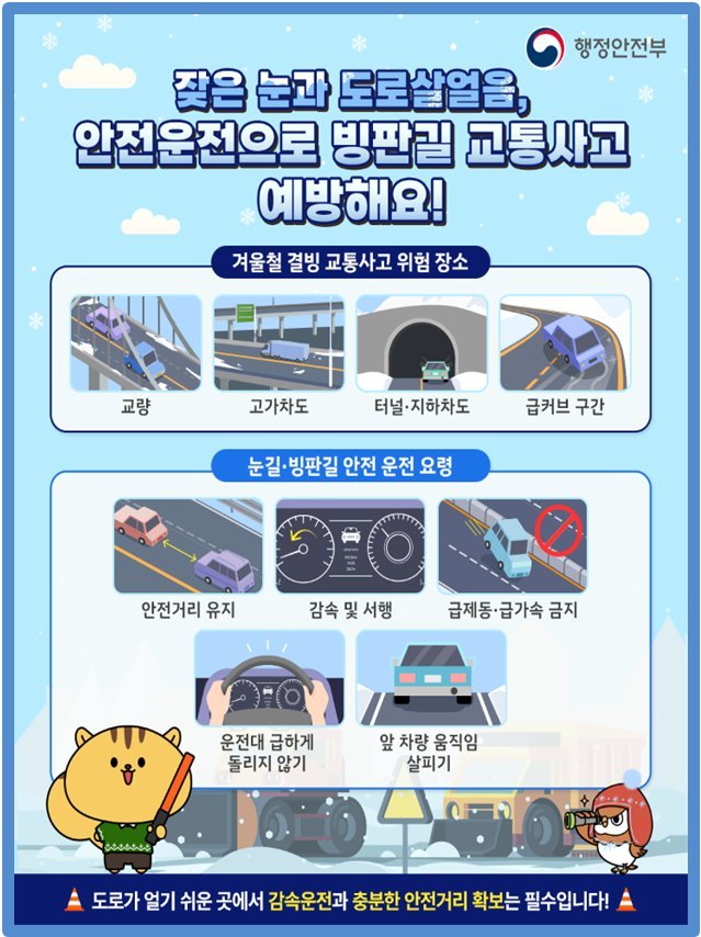 [아시아월드뉴스] 행정안전부는 겨울철에 발생하기 쉬운 빙판길 교통사고에 각별한 주의를 요청했다.