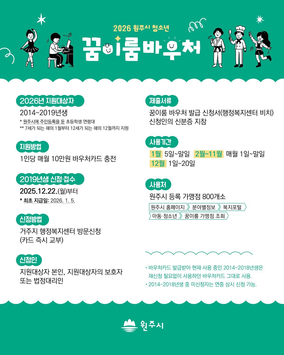 [아시아월드뉴스] 원주시는 오는 22일부터 지역 아동의 건전한 성장을 지원하기 위한 ‘2026년 원주시 청소년 꿈이룸 바우처’신규 이용자 모집을 시작한다.