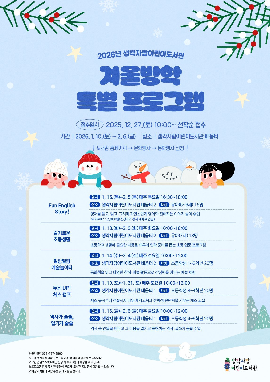 이훈주 도서관장은 “겨울방학 동안 어린이들이 도서관에서 배움과 즐거움을 함께 경험하길 기대한다”라며, “독서와 체험 활동을 통해 도서관을 더욱 친숙한 공간으로 느끼는 계기가 되길 바란다”라고 말했다.
