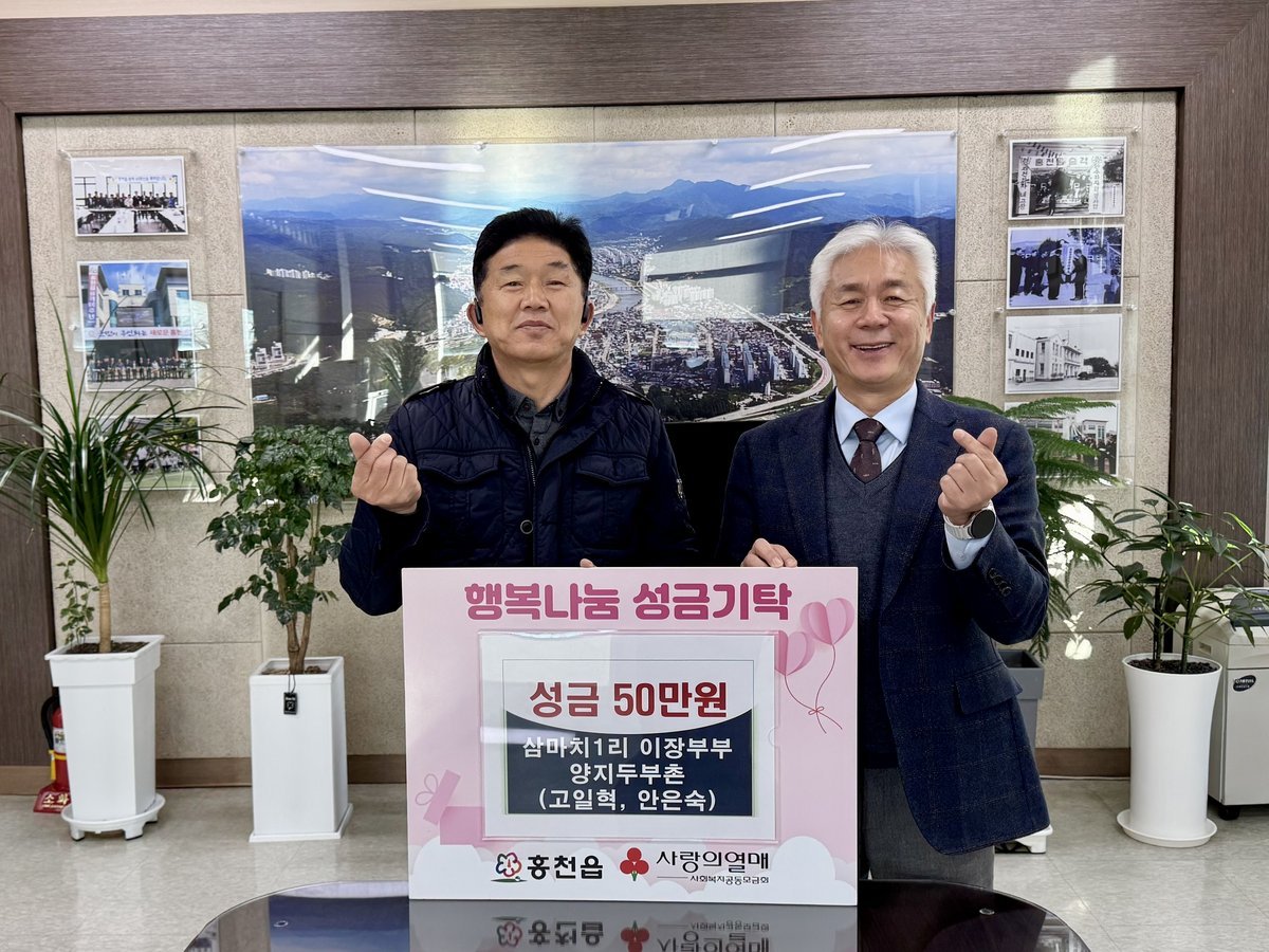 홍천읍 옥류동길 169에 위치한 음식점을 운영 중인 삼마치1리 이장 부부가 지난 12월 26일 홍천읍 행정복지센터를 찾아 성금 50만 원을 전달하며 지역사회에 온정을 전했다.
