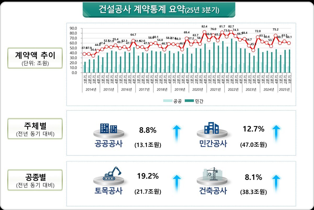 [아시아월드뉴스] 국토교통부는 ’25년 3분기 건설공사 계약액이 전년 동기 대비 11.9% 증가한 60.1조 원을 기록하였다고 밝혔다.