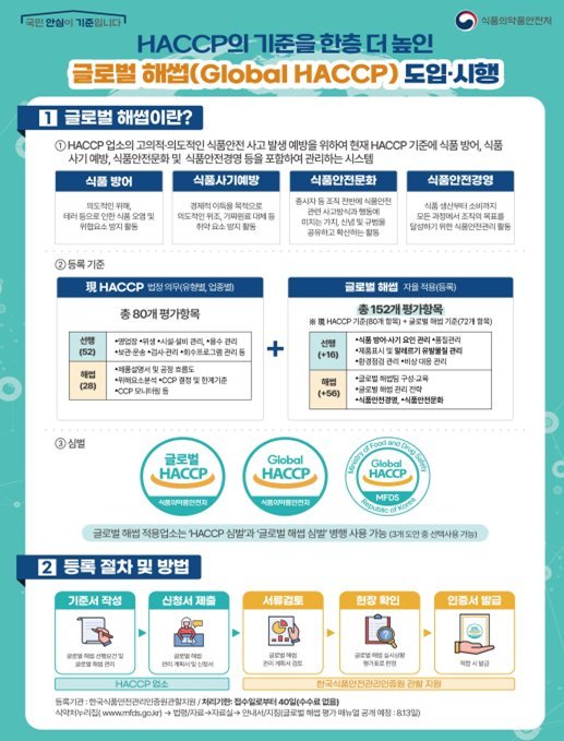 식약처는 2025년 8월 국내·외 식품 제조 환경, 기준 변화 등에 발맞춰 국제기준에 부합하는 글로벌 해썹을 도입하였다. 올해에는 글로벌 해썹의 저변 확산과 조기 정착을 위해 전문 심사·지도 인력 양성, 영업자 교육프로그램 개발·보급, 해썹 인증 유효기간 연장심사 시 가점 부여 등을 추진한다.