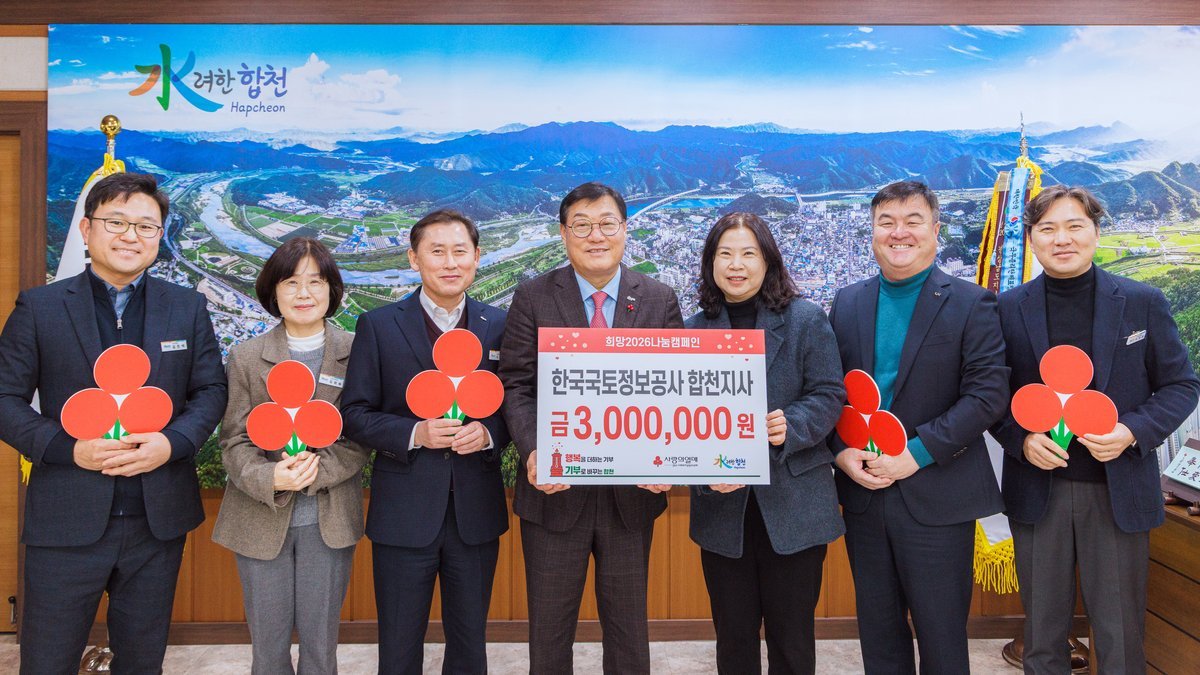 [아시아월드뉴스] 합천군은 8일 한국국토정보공사 합천지사가 합천군청을 방문해 관내 저소득세대를 돕기 위한 이웃돕기 성금 300만원을 지정기탁했다고 밝혔다.