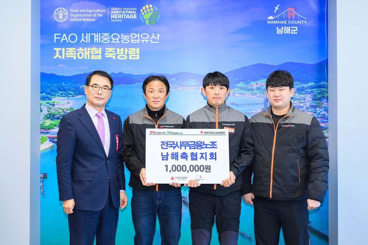 [아시아월드뉴스] 전국사무금융노조 남해축협지회는 12일 이웃돕기 성금 100만원을 남해군에 기탁했다.