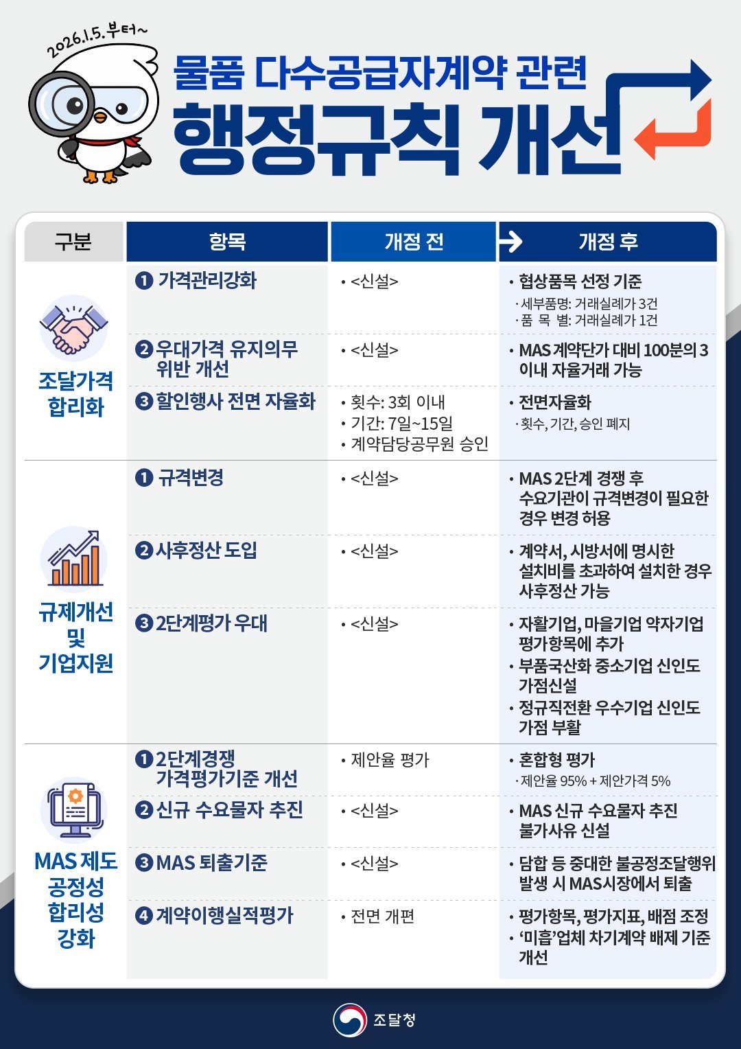 [아시아월드뉴스] 조달청은 조달 가격의 신뢰성을 높이고, 공공조달에 남아 있는 불합리한 규제를 혁파하기 위해 「물품 다수공급자계약 관련 행정규칙 2종*」을 개정하여 2026년 1월 5일부터 시행했다고 밝혔다.