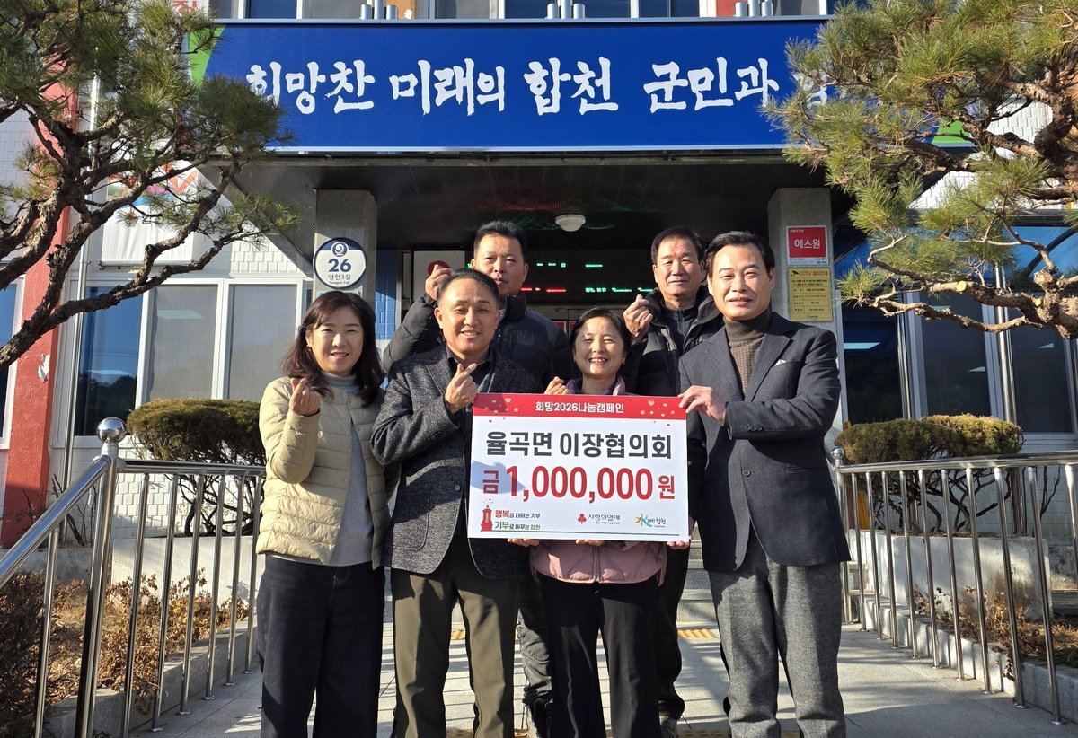 이병걸 율곡면장은 "이장협의회 회원님들의 소중한 정성이 지역의 어려운 이웃들에게 큰 희망이 될 것이다. 전해주신 성금은 어려운 이웃들이 추운 겨울을 따뜻하게 보낼 수 있도록 잘 전달하겠다"고 전했다.