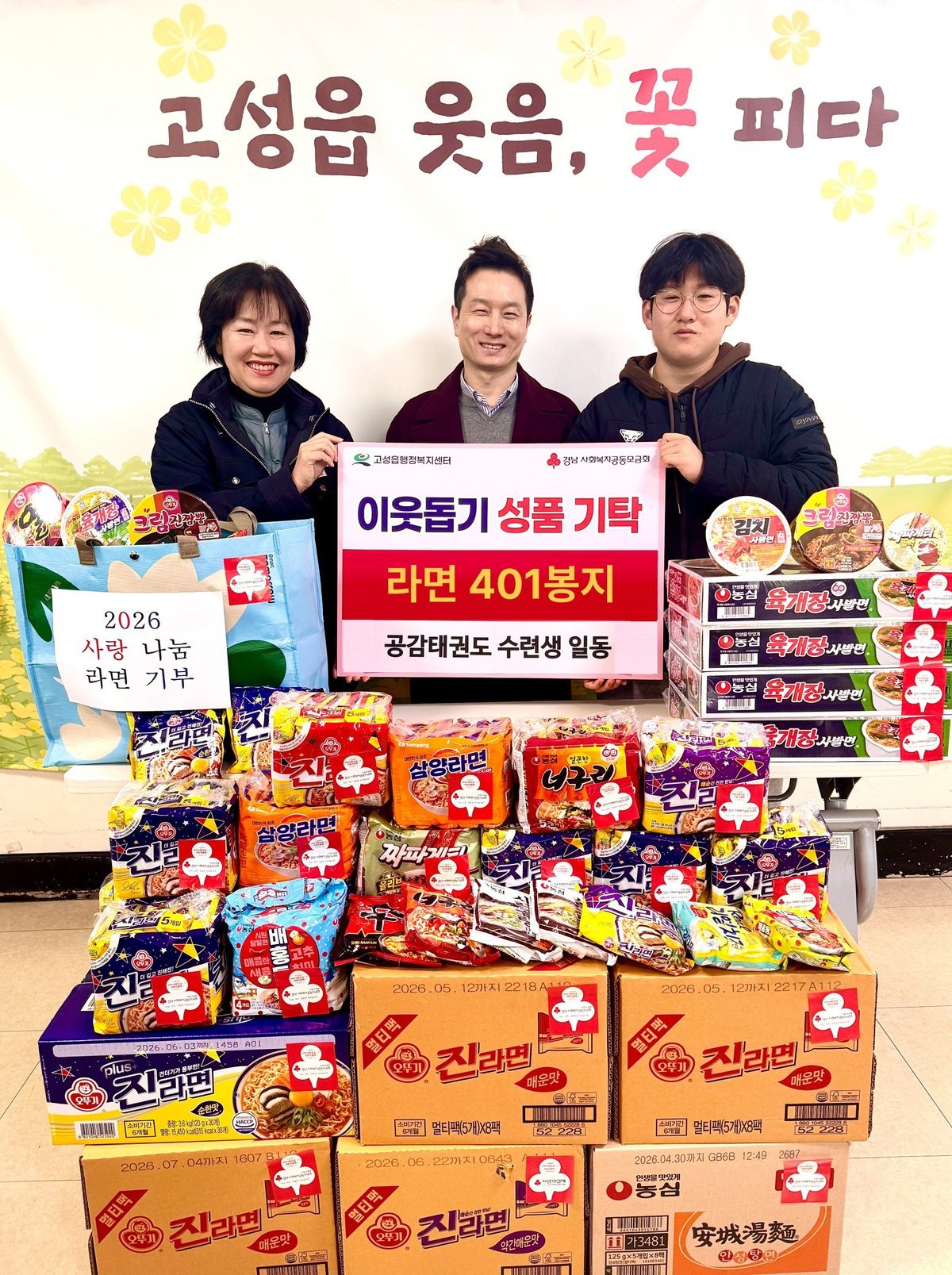 이현주 고성읍장은 “어려운 이웃을 돕고자 나선 아이들의 순수하고 따뜻한 마음에 깊은 감동을 받았으며, 이웃사랑을 몸소 실천해 주신 공감태권도 관장님께도 진심으로 감사드린다”라며, “아이들 한 명 한 명의 정성이 담긴 라면을 도움이 필요한 이웃들에게 잘 전달하겠다”라고 말했다.