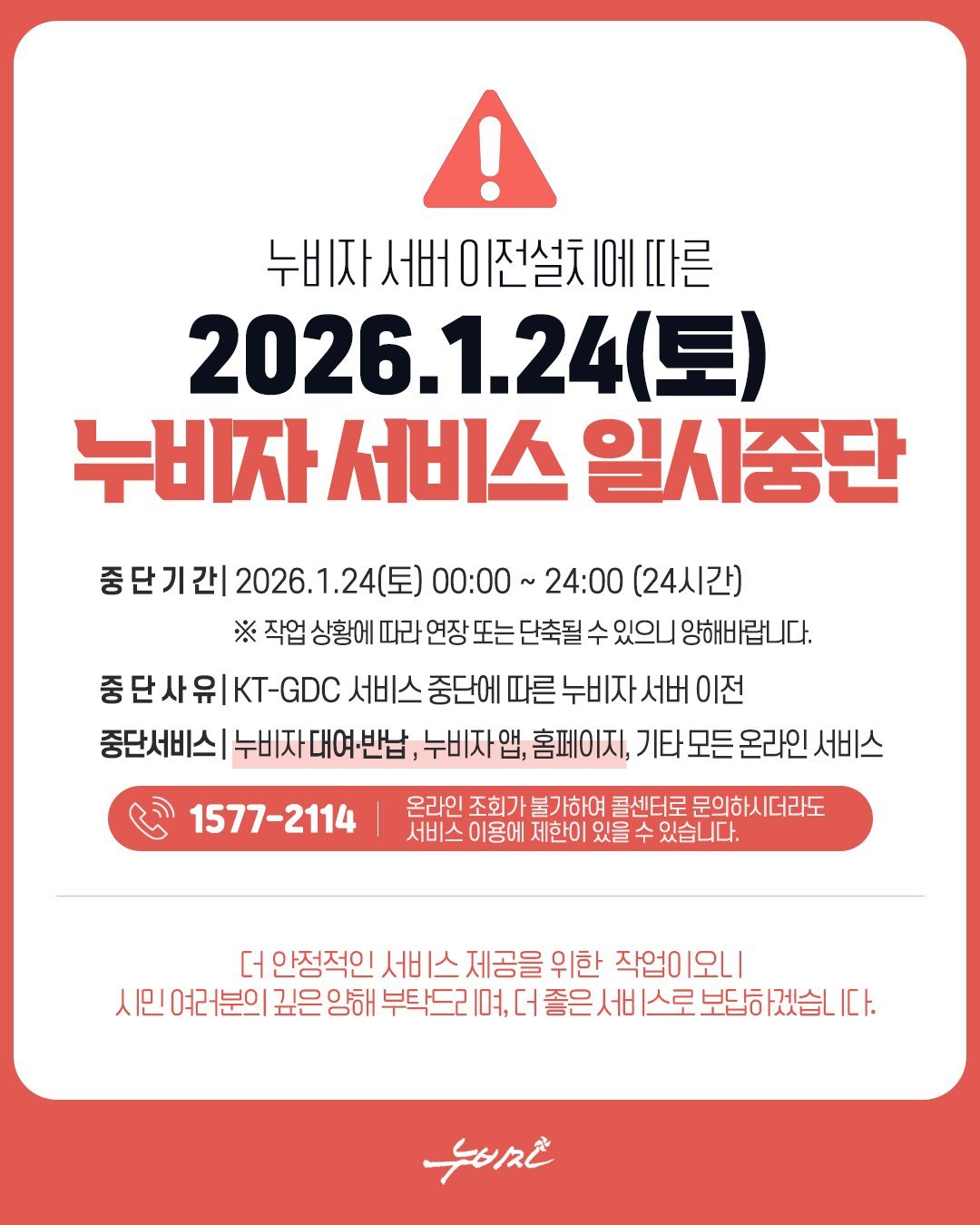 누비자 서비스는 1월 24일 00시부터 모든 대여소의 대여·반납, 누비자 누리집, 모바일 앱 등 온라인 서비스 이용이 일시적으로 중단된다.