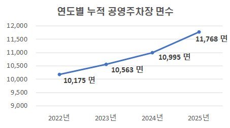 연도별 누적 공영주차장 조성 현황을 보면 △2022년 1만175면 △2023년 1만563면 △2024년 1만995면 △2025년 1만1768면으로 주차 공간은 매년 점진적으로 증가해 왔다.