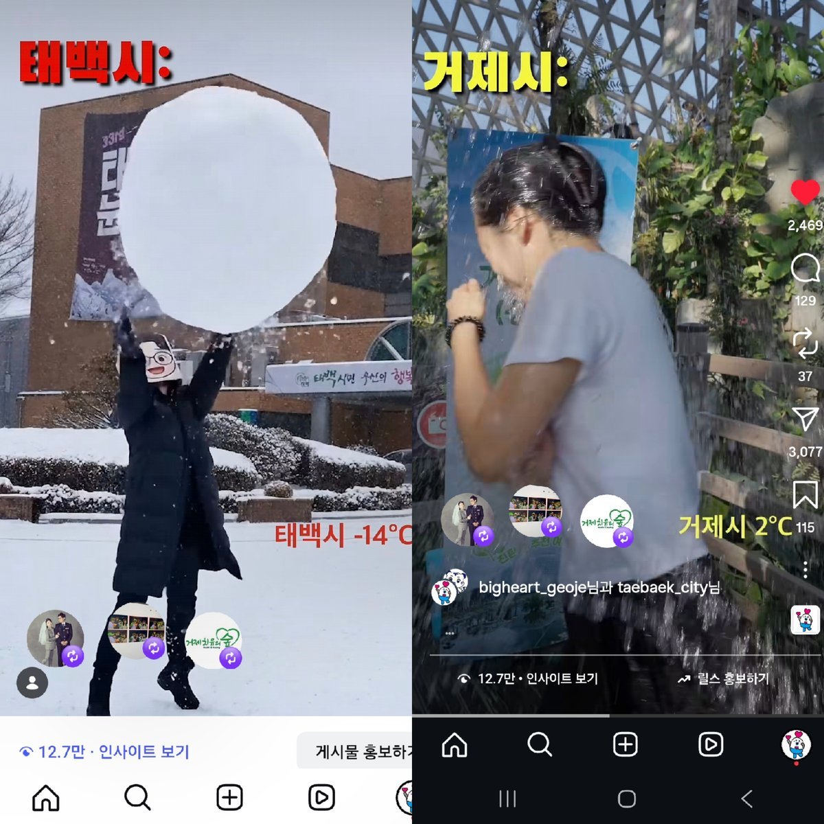 이번 영상은 눈이 자주 내리고 기온이 낮은 태백시와, 상대적으로 따뜻하고 눈이 거의 오지 않는 거제시의 기후 차이를 활용한 지자체 협업 콘텐츠다.
