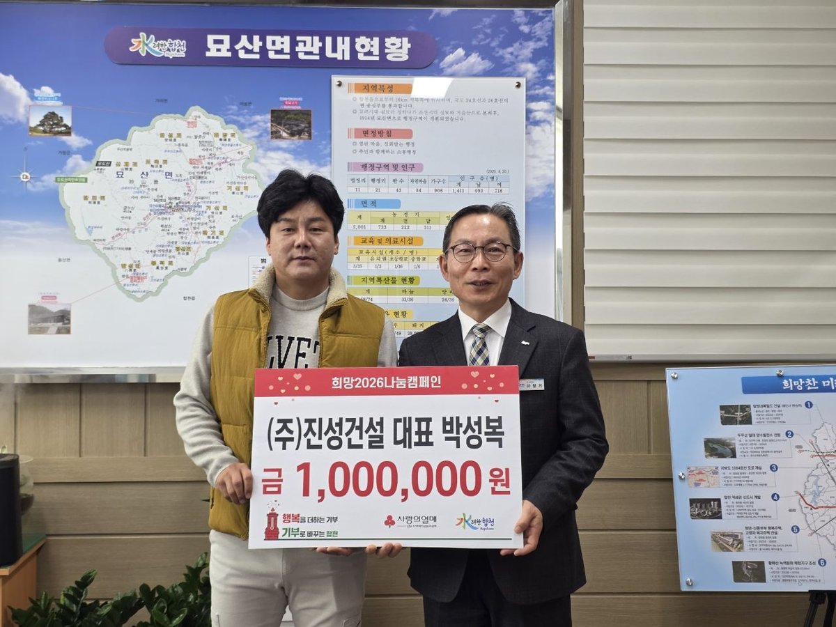 [아시아월드뉴스] 진성건설 대표 박성복은 15일 묘산면사무소를 방문해 지역 내 어려운 이웃을 위해 써 달라며 성금 100만원을 기탁했다.