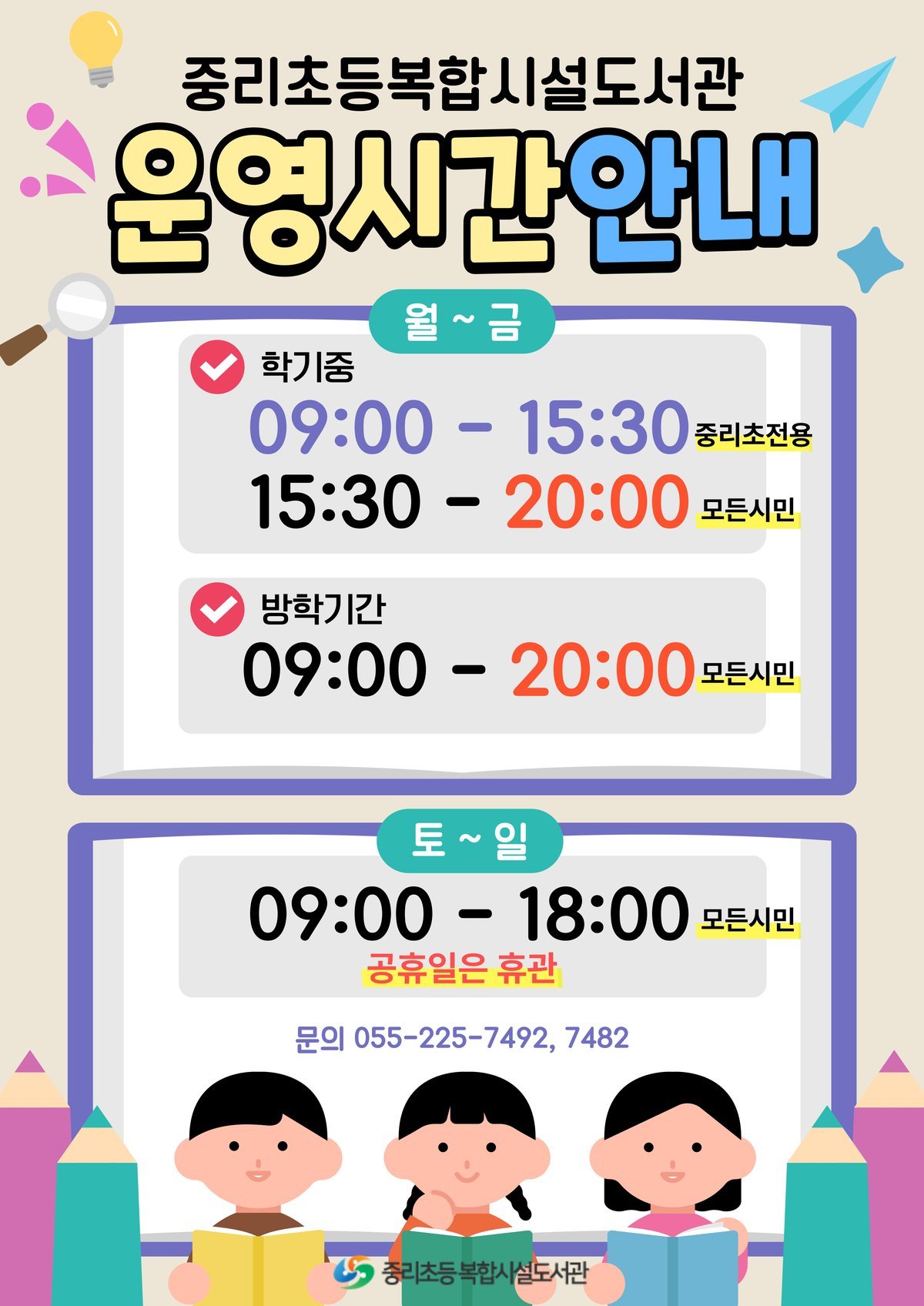중리초등복합시설도서관의 자세한 이용 시간 및 문화 행사 사항은 도서관 누리집 또는 중리초등복합시설도서관 자료실로 문의하면 된다.