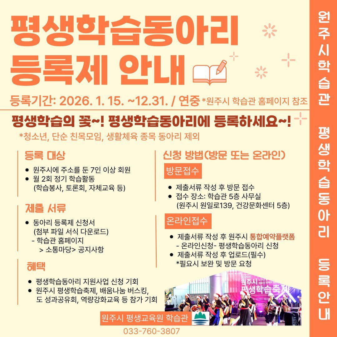 [아시아월드뉴스] 원주시 평생교육원 학습관은 관내에서 활동하고 있는 잠재적 평생학습동아리를 발굴하기 위해 ‘평생학습동아리 등록제’를 운영하고 있다.