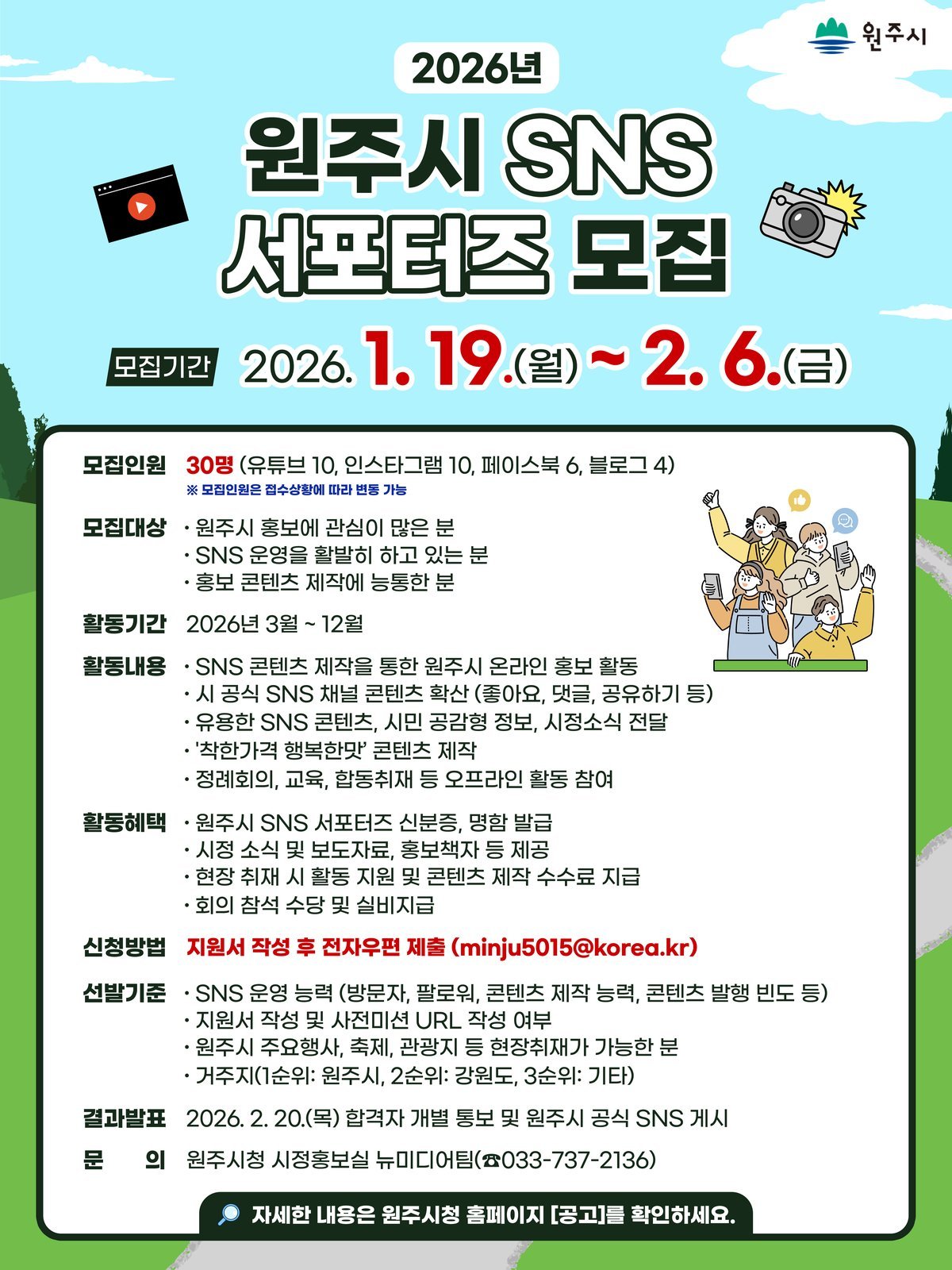 [아시아월드뉴스] 원주시는 참신한 아이디어와 열정을 가진 ‘2026년 원주시 SNS 서포터즈’를 다음 달 6일까지 모집한다.