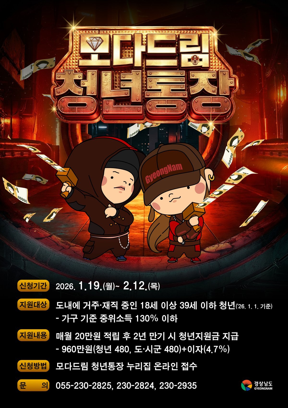 [아시아월드뉴스] 경상남도와 경남투자경제진흥원은 청년의 자산 형성과 지역 정착을 돕는 ‘모다드림 청년통장’ 상반기 참여자를 이번 달 19일부터 2월 12일까지 모집한다고 밝혔다.