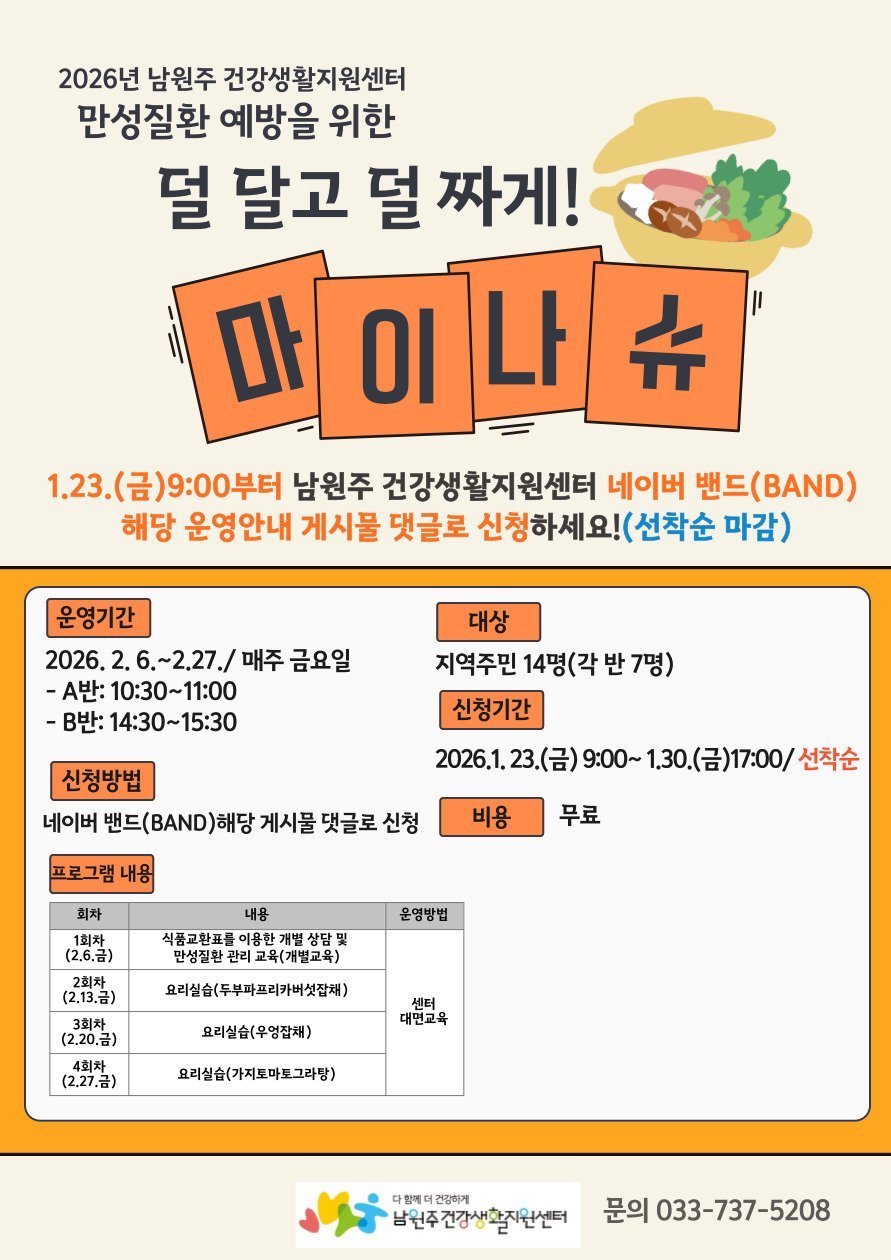 [아시아월드뉴스] 남원주건강생활지원센터는 지역 주민의 만성질환 예방과 관리를 위해 ‘덜 달고 덜짜게 마이나슈 요리교실’프로그램 참여자를 모집한다.